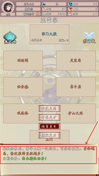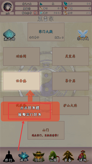 1、进入【震雷宗】后点击【任务楼】接取宗门任务,完成任务可获取贡献提升宗门地位。