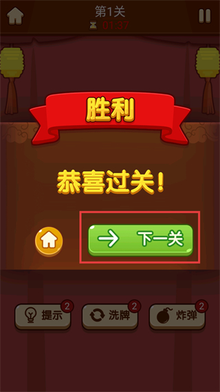 4、关卡通关后出现【胜利!】提示,点击【下一关】按钮进入后续关卡,继续进行麻将对碰的挑战。