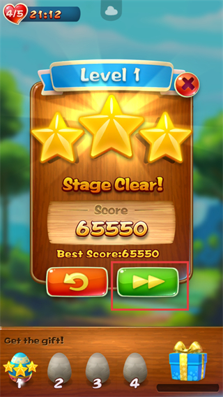 4、通关【Level1】获得三星评价与【Score-65550】,点击绿色按钮进入下一关,继续消除挑战。