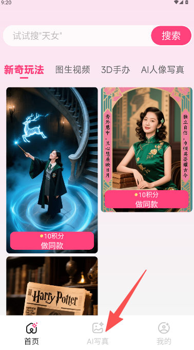 3、积分管理与导航功能通过我的页面查看与管理积分,并通过底部导航栏在首页、AI写真等板块切换。