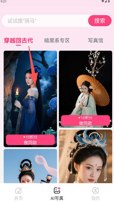 2、在AI写真页浏览风格(如古风、暗黑系)并选择造型(如山中妖姬)。