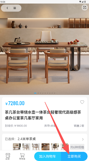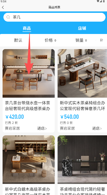 1、在首页底部“商城”图标,点击商品如“茶几”。