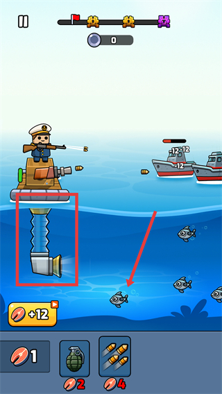 2、操控水下装置捕捉鱼类,获取【+12】食物资源,同时用武器攻击敌方船只削弱其战力。