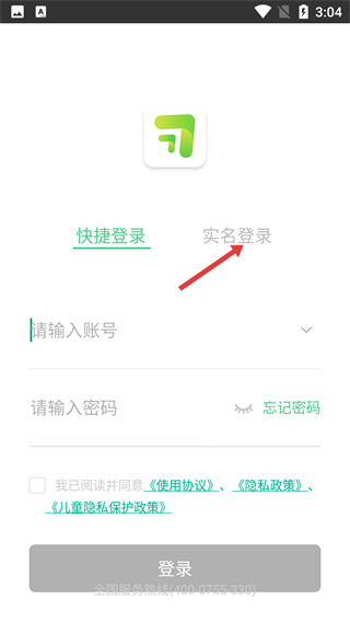 1、进入登录页面,默认显示【快捷登录】,点击切换至【实名登录】选项,启动实名登录的操作流程。