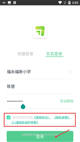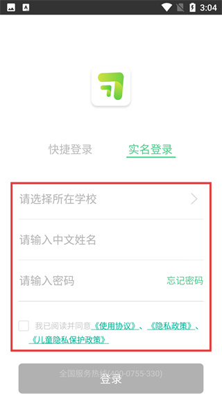 4、填好学校、姓名、密码后,勾选【我已阅读并同意】相关协议,点击【登录】按钮,完成实名登录的操作。