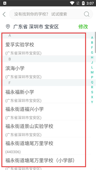 3、进入学校选择页面,可选取当前定位地区下的学校。