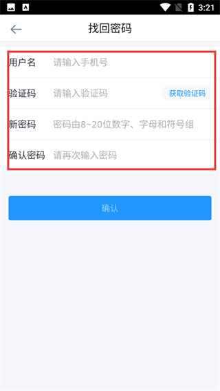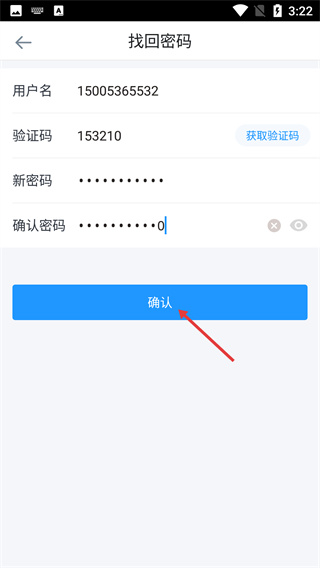 4、填写收到的【验证码】,输入符合要求的【新密码】与【确认密码】后,点击【确认】按钮,完成密码找回的操作。