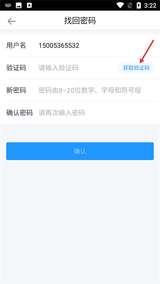 3、在【找回密码】页输入手机号后,点击【获取验证码】按钮,触发验证码的发送操作,等待接收对应的验证信息。