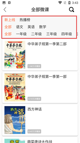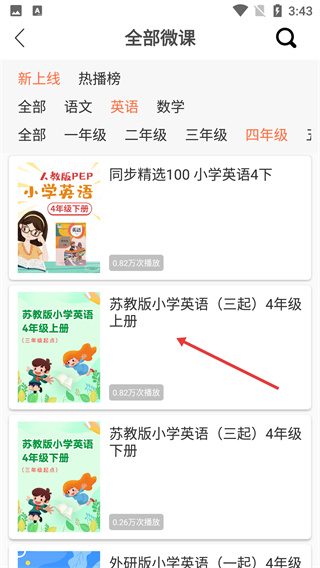 2、在【全部微课】页,通过顶部【新上线/热播榜】标签,结合【学科】与【年级】分类,精准筛选目标课程。