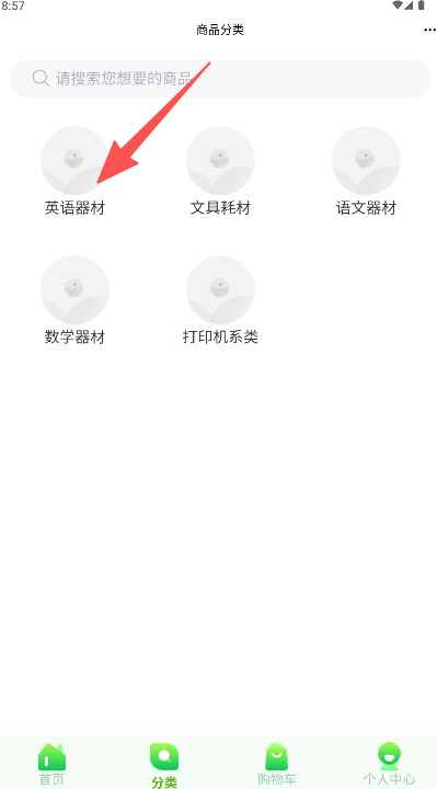 1、商品分类浏览功能允许在首页或商品分类页点击英语器材图标,进入对应品类的商品列表页面。
