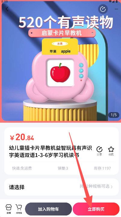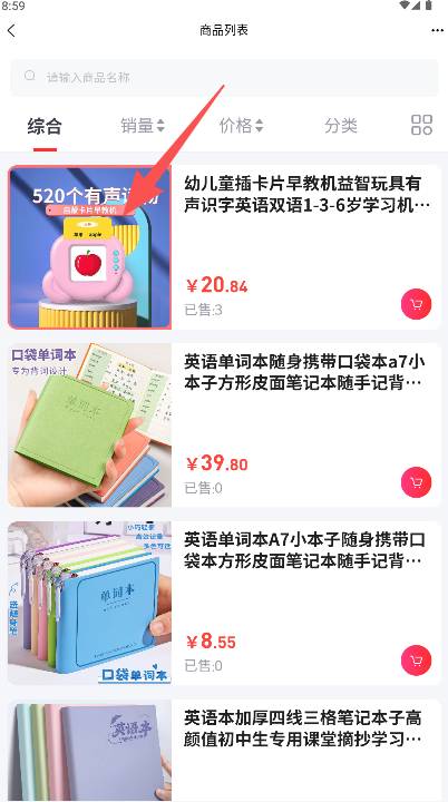 2、在商品列表页查看并选择目标商品(如520个有声启蒙卡牌)。