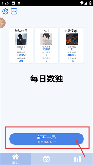 1、进入界面后会看到账号卡片,找到【每日数独】区域,点击【新开一局-可用红心-5个】按钮,即可开启数独对局。