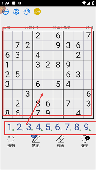 2、进入数独对局后,棋盘下方有数字1-9选择栏,同时可借助【撤销】【笔记】【擦除】【提示】功能,辅助完成数独填写。