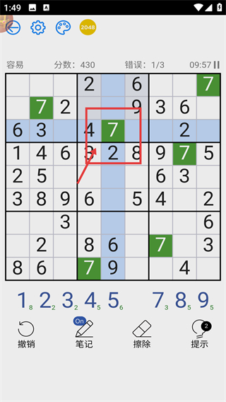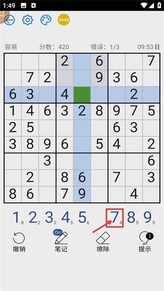 3、填数时可点击下方数字(如【7】)填入棋盘空格,此时留意分数变化,同时注意错误次数【1/3】的剩余额度。