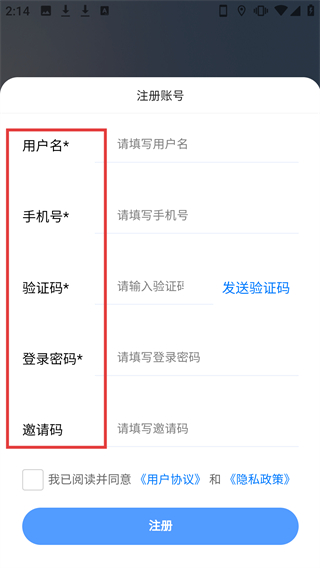 4、在【注册账号】页面填写【用户名】【手机号】【验证码】【登录密码】,勾选协议后点击【注册】完成操作。