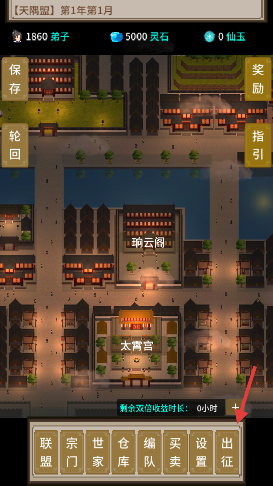 1、在“天隅盟”宗门界面,点击右下角【出征】按钮。