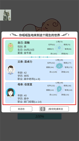 2、查看【自己】【父亲】【母亲】的属性面板,确认初始设定后点击【就选他】开始人生。