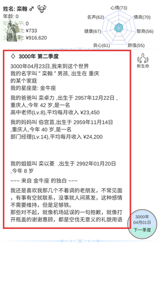 3、阅读角色背景介绍,了解【3000年】【第二季】的家庭情况,为后续人生做准备。