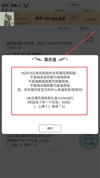 4、处理【满月酒】随机事件,确认祝福信息可获得礼金与【心情】【智商】属性提升。