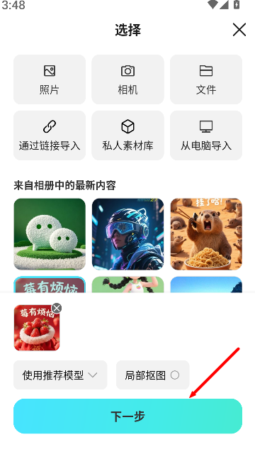 2、选中照片后点击“下一步”,进入编辑页面,可调整布局、文字或进行简单处理。