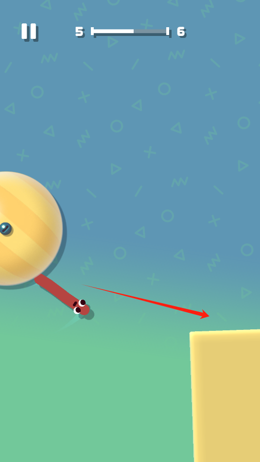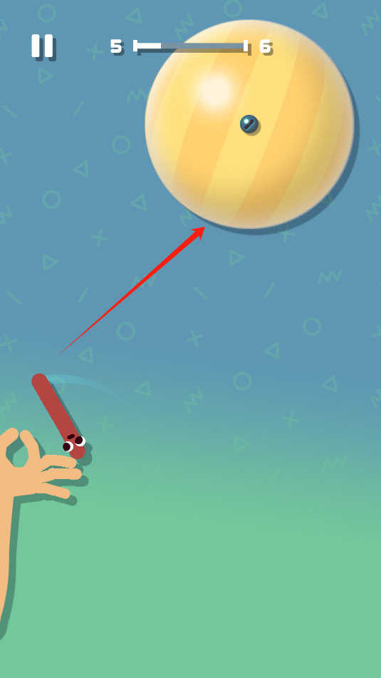 1、游戏中,按住屏幕滑动,利用香肠的弹力将自己弹出去,贴在上方的圆球上。