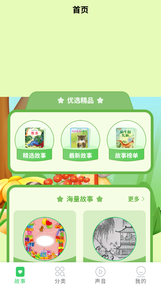 1、打开APP,进入故事页面,可选择各类故事进入播放。