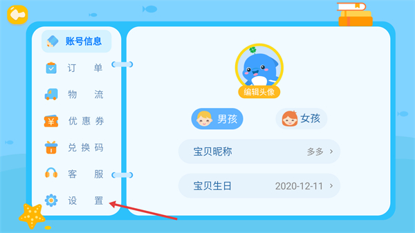 3、进入包含【账号信息】【订单】等选项的界面,找到【设置】入口。