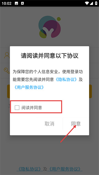 1、在协议确认弹窗中,勾选【阅读并同意】选项,点击【同意】按钮,完成《隐私协议》及《用户服务协议》的确认,进入后续操作页面。