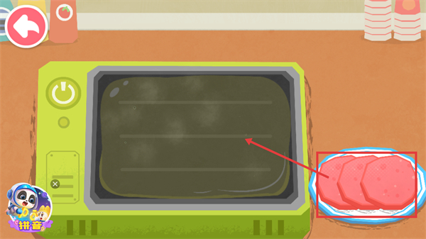 3、完成火腿切割后,将红色框选的火腿盘放入【烤箱】内,启动加热流程,推进早餐的制作进度。