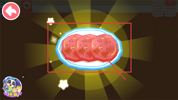 4、完成烹饪后,查看红色框选的火腿成品(带星光特效),确认早餐制作完成,可推进至下一个烹饪任务。