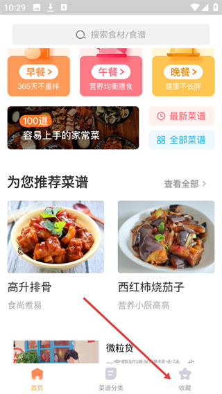 1、界面有【搜索食材/食谱】入口,点击底部【收藏】按钮,可进入收藏相关页面。