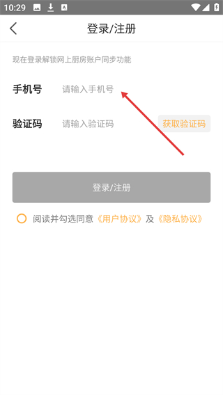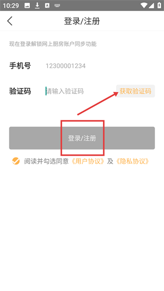 4、在【登录/注册】页填写手机号后,点击【获取验证码】,勾选协议,输入验证码后即可点击【登录/注册】按钮完成操作。