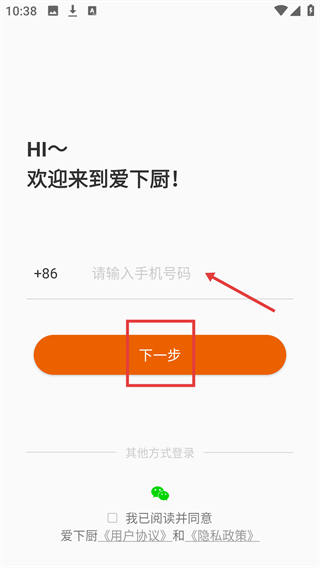 1、进入爱下厨欢迎页,填写【请输入手机号码】,勾选【用户协议】和【隐私政策】后,点击【下一步】进入注册环节。