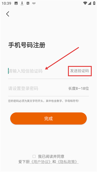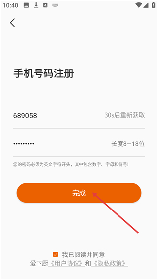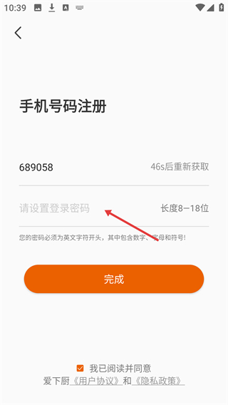 4、填好验证码与符合要求的登录密码,点击【完成】按钮完成爱下厨的手机号码注册。