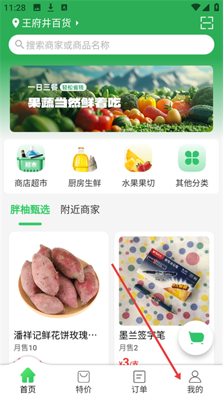 1、胖柚首页有【搜索商家或商品名称】入口,点击底部【我的】按钮可进入个人相关页面。