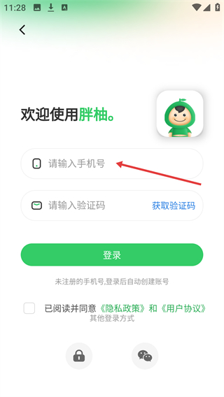3、胖柚登录页需填写【请输入手机号】,还需勾选协议。