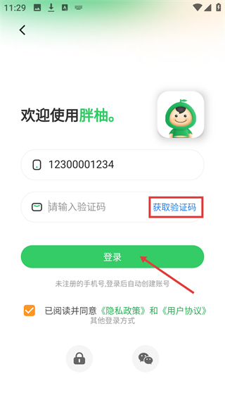 4、在胖柚登录页填好手机号,点击【获取验证码】后可进行登录操作。