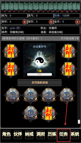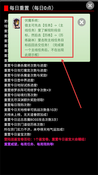 1、新手指引先看【伏魔系统】提示,去【任务】-【主线任务】了解目标,再到【历练】-【历练副本】击败目标后交任务推进流程。