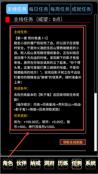 3、在主线任务界面阅读【第一章荒村奇遇1-1】剧情,了解需击败【影子鬼】的任务要求,准备前往历练副本挑战。