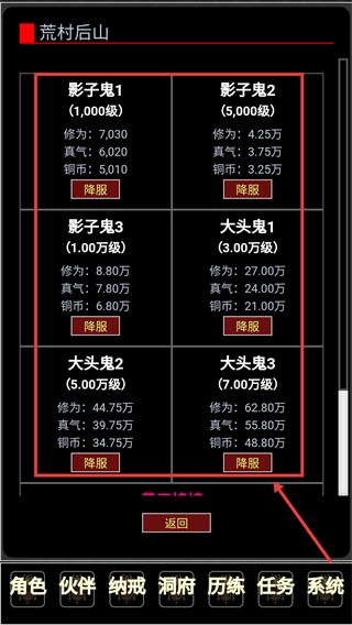 4、进入【荒村后山】副本界面,根据自身等级选合适怪物,先尝试降服【影子鬼1】积累修为与资源逐步提升实力。