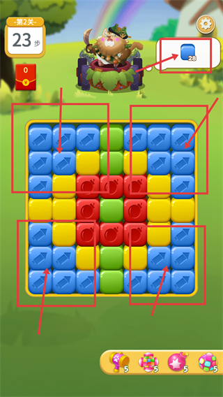 2、瞄准红色框选的【蓝色方块密集区】,优先消除该区域,提升消除效率。