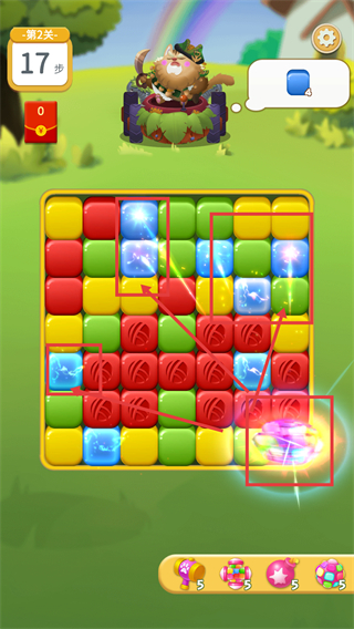 3、触发红色框选的【特效方块】,利用其范围消除效果,快速推进蓝色方块的收集进度,此时剩余步数【17步】,足够完成目标。