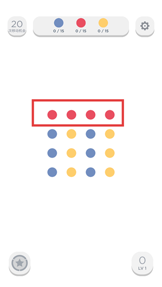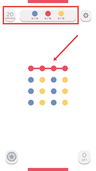 3、连接顶部的【红色-圆点】,完成消除以推进进度,同时关注【20-次移动机会】的剩余次数。