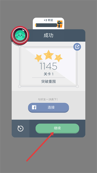 4、通关后显示【成功】界面,获得【3-颗星】和积分,点击【继续】按钮进入下一个关卡。