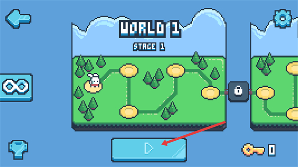 1、在【WORLD-1-STAGE-1】界面,点击箭头按钮进入关卡,操控兔子在地图中移动,目标收集道具。