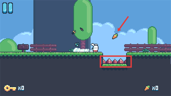 2、在关卡场景中,遇到【尖刺】陷阱时【点击屏幕】使兔子进行跳跃躲避陷阱,顺便收集【胡萝卜】道具。