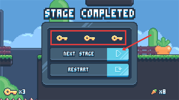 4、通关后显示【STAGE-COMPLETED】,获得【3-把钥匙】,点击箭头按钮进入【NEXT-STAGE】。