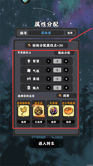 2、属性分配时优先加智慧和气运,智慧影响修行速度气运提升宝物获取率,选神龙戒增强初期防御。