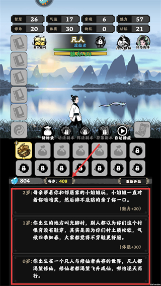 3、主界面查看事件日志了解属性变化,利用储物袋存放宝物,通过功法副本积累修行资源提升修为。