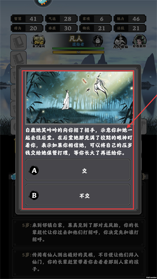 4、遇到白鹿保管压岁钱选择交,后续可能获得她的帮助提升气运,助力早期修行积累更多资源。